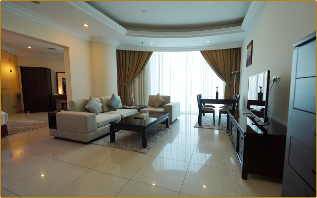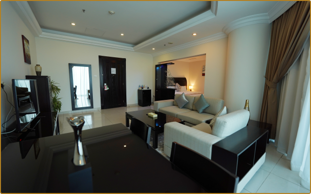 Spacious suite with a separate sitting area and a satellite LCD TV.